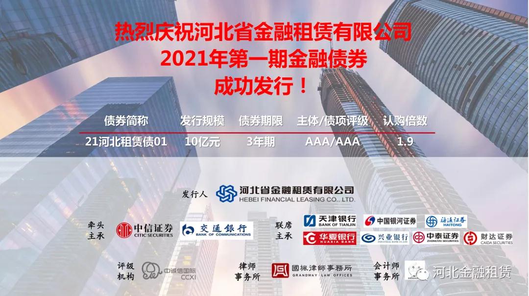 日前,河北省金融租賃有限公司(以下簡稱“河北金租”或“公司”)成功發(fā)行2021年第一期金融債券,本期債券由中信證券和交通銀行為牽頭主承銷商,獲得了各家金融機(jī)構(gòu)的積極認(rèn)購,發(fā)行規(guī)模10億元,期限3年。此次債券的圓滿發(fā)行進(jìn)一步在市場樹立了河北金租穩(wěn)健進(jìn)取、持續(xù)發(fā)展的形象。