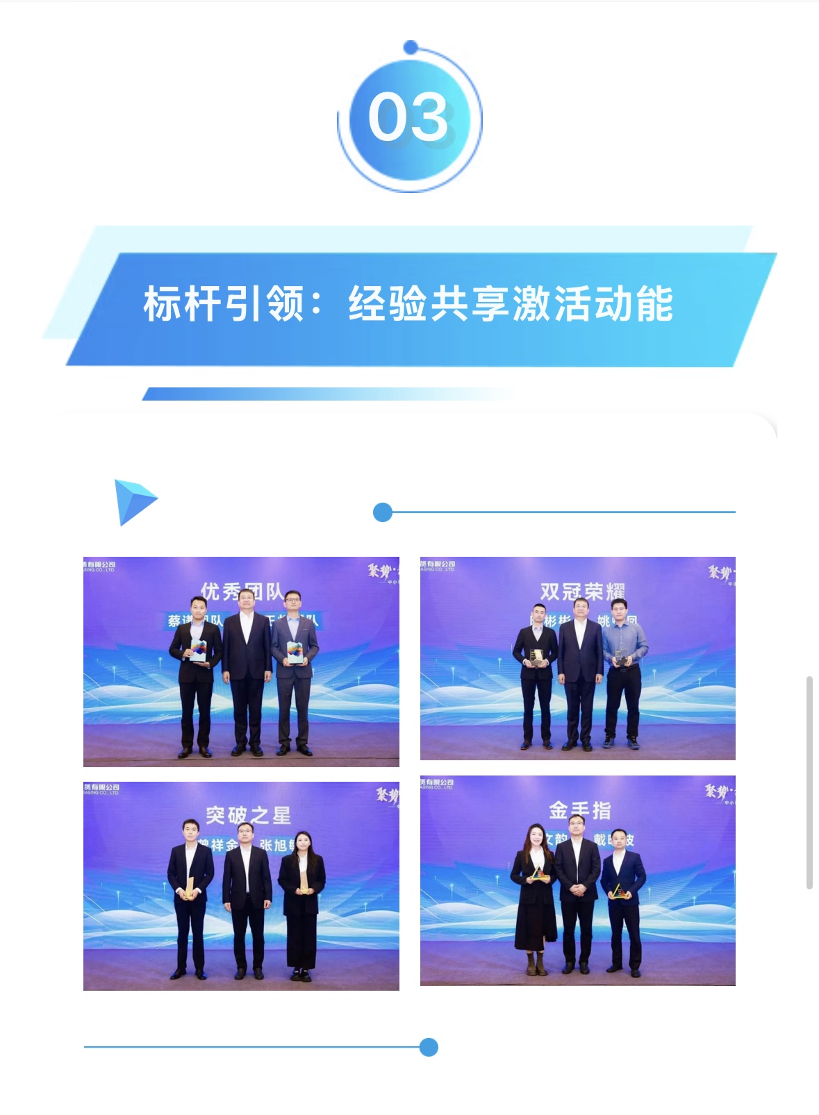 在榮譽時刻環節,21位優秀員工依次登臺,接受屬于他們的榮耀時刻。通過優中選優,團隊推出由6位業務精英,登臺分享業務破局密碼,內容涵蓋客戶談判策略、優秀團隊經營理念、渠道建設經驗等……現場伙伴受益匪淺。